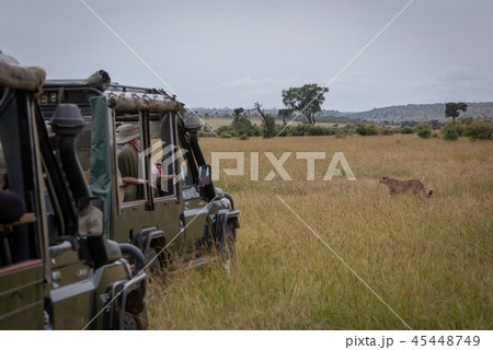 Cheetah walks past photographers in two trucks
