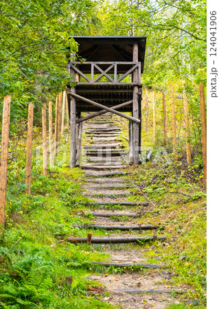 The sturdy wooden guard tower stands at the top of a well-worn staircase, surrounded by lush greenery in the former labor camp Svornost in Jachymov, Czechia. This historic site evokes reflection.