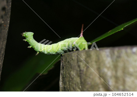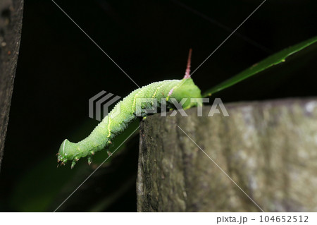 若草色の大型の芋虫、スズメガ科の幼虫が人工丸太の先で伸びる(マクロレンズ使用・自然光・接写写真)