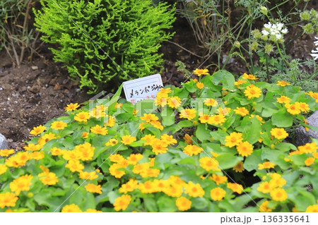 花壇で鮮やかな黄色い花を咲かす、メランポジウム