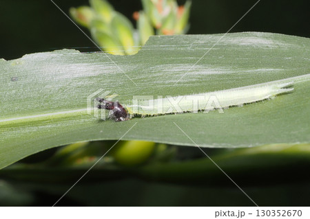 ススキの葉に黒い角頭に黄緑色のクロコノマチョウの幼虫(自然光+ストロボ、マクロ接写撮影)