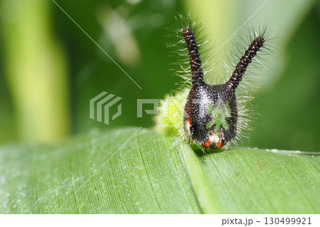 かわいい黄緑ボディに真っ黒な長毛ウサギ顔のクロコノマチョウの幼虫(自然光&ストロボ・マクロ接写)