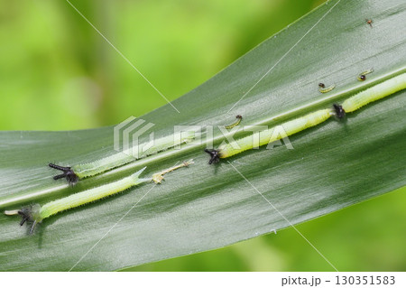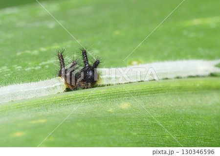 生き物 昆虫 クロコノマチョウ、若齢幼虫です。八月初め、ジュズダマの葉に群れいていました