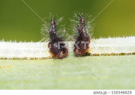 ススキの葉にウサギ耳の黒い頭がかわいいクロコノマチョウ幼虫たち(アウトドアフィールド昆虫マクロ撮影)