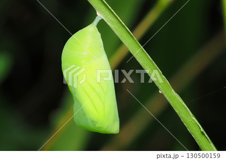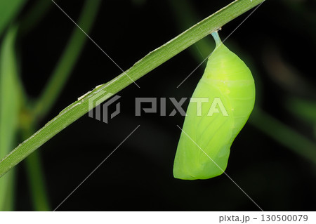 美しい黄緑色のクロコノマチョウのサナギ(自然光+ストロボ、マクロ接写撮影)