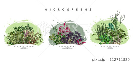 Set of hand drawn colorful micro-green sprouts with names sketch style