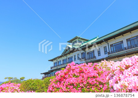愛知県蒲郡市、満開のつつじと蒲郡クラシックホテルの風景