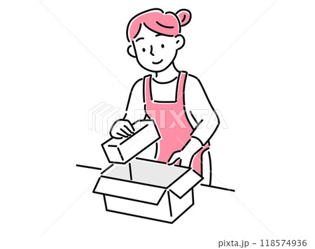 段ボールに荷物をいれるエプロン姿の若い女性