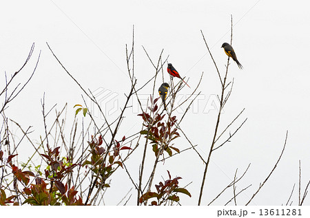 Scarlet Minivet birds, Males are redness, Female and the chicks
