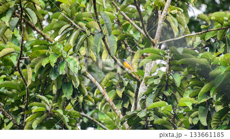Orange minivet male (Pericrocotus flammeus) bird perched in dense tree canopy at Sinharaja Forest Reserve