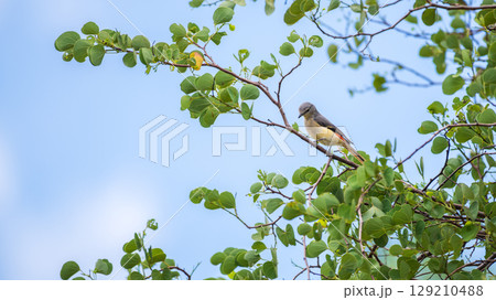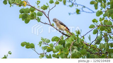 Small minivet juvenile bird perched on a branch at Yala National Park, Sri Lanka. Surrounded by green leaves and a clear blue sky