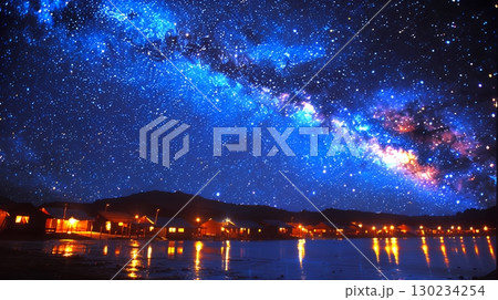 【山梨県】皆既月食の夜、山中湖から見る富士山(山小屋の灯りと湖岸の煌めき)