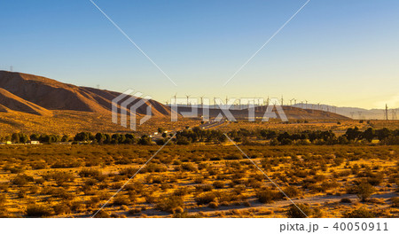 Windmills along a highway in Mojave desert, California