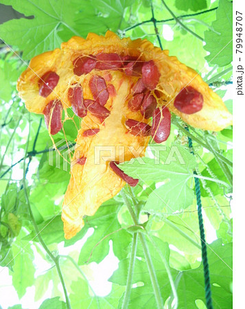 収穫時期を逃してしまい、オレンジ色に完熟して裂けたゴーヤの果実と赤い種子