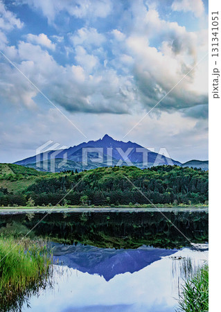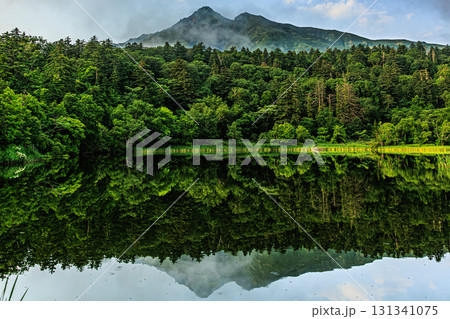 北海道利尻島の姫沼から見た湖畔の森から顔を出す利尻富士と沼に映る逆さ富士が美しい風景