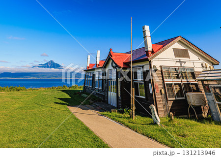 青空に映える赤屋根の校舎と利尻富士のコントラスト