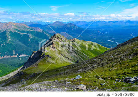 View of Nenana river valley from Mount Healy hike trail with blue sky with white clouds above