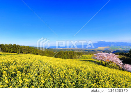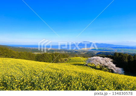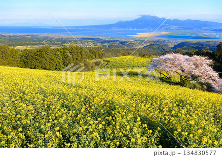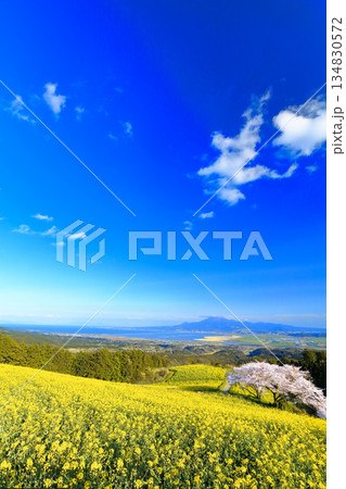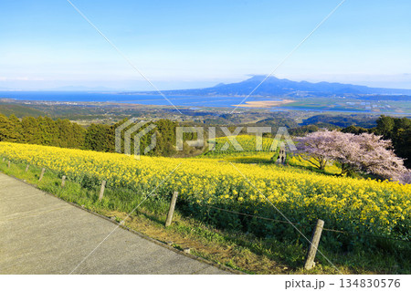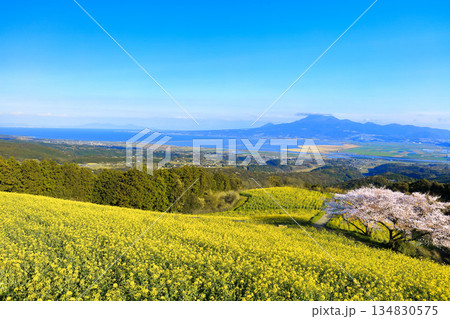 【長崎県】快晴の白木峰高原の満開の桜と菜の花畑