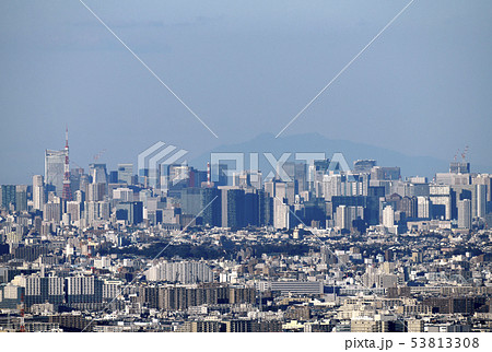 日本の東京都市景観 東京スカイツリーや東京タワー、六本木ヒルズ、渋谷などの街並みを望む