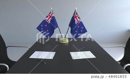 Flags of New Zealand and papers on the table. Negotiations and signing an agreement. Conceptual 3D