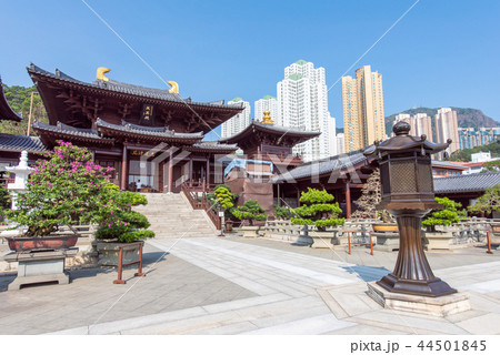 Chi Lin Nunnery and Nan Lian Garden with Housing Estate of Hong Kong