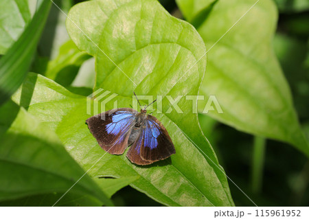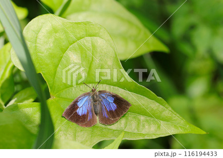 深い森の中、青葉上で休む蝶「ムラサキツバメ」(マクロレンズ写真)