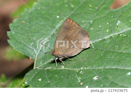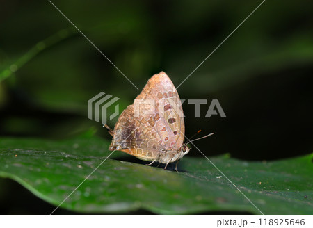 照葉樹林の葉上に警戒心が強く俊敏な茶褐色のムラサキシジミ蝶(自然光+ストロボ、マクロ接写撮影)