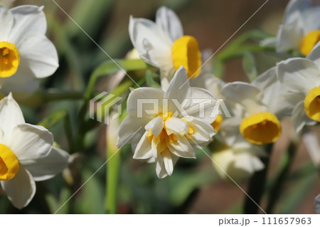冬の庭に咲く白と黄色のフサザキスイセンの花