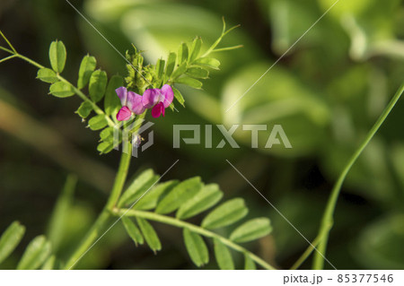 早春の野原に咲くカラスノエンドウのピンクの花