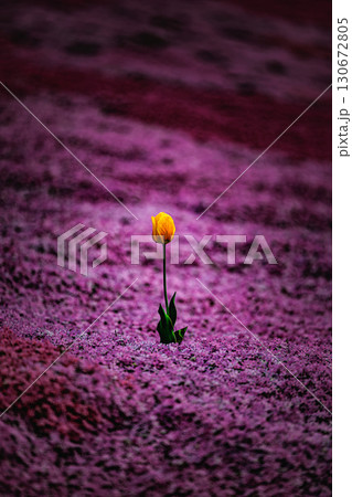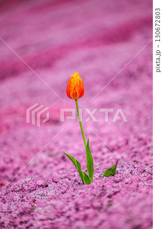 孤高に咲くチューリップと芝桜の景色