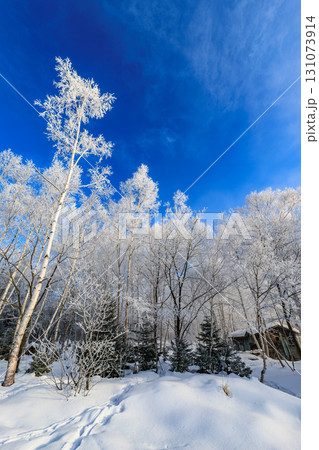 北国の静寂、雪原に立つ白樺の樹氷