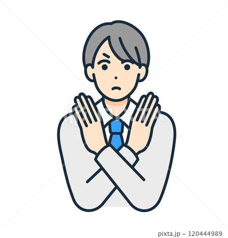 胸の前で手を交差し拒否を表すジェスチャー。手でバツを作る男子高生のベクターイラスト素材。