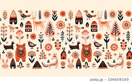 Simple minimalist Scandinavian pattern with forest animals cozy cottages