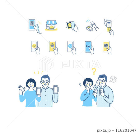 スマホを持っているカップル・キャッシュレス決済のアイコン