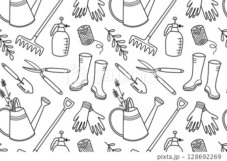 Flat cartoon vector pattern, black and white gardening tools and equipment. Seamless background with rakes, shovels, rubber boots, gloves, sprayers. Gardening theme, seasonal outdoor work