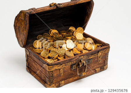 A vintage wooden treasure chest with its lid open, overflowing with a pile of shiny gold coins, all on a simple white background.