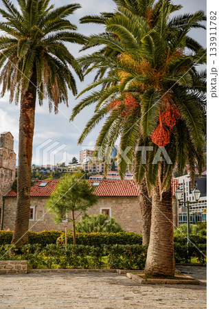 Scenic view of tall Mediterranean palm trees rising above the historic Old Town of Budva, Montenegro. Highlights classic stone buildings, narrow streets, and charming coastal architecture. Ideal for