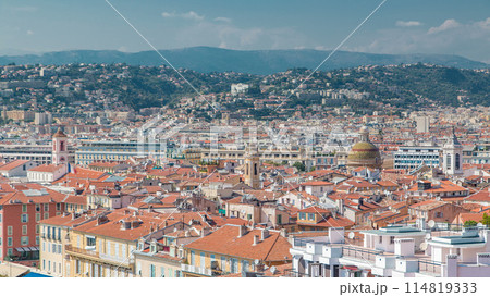 Bright sun lights red roofs of the old city timelapse. Aerial view from Shatto's hill. Nice, France