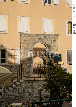 Close-up of a stone arch serving as the entrance to a residential house in the historic old town of Budva, Montenegro. Focus on medieval architecture, traditional European buildings, and authentic