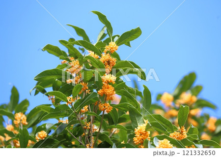 秋の花の金木犀のオレンジ色と澄んだ青空