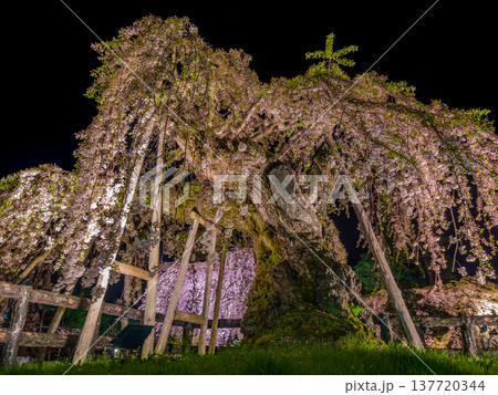 支柱に支えられた太い幹から枝を広げる満開のシダレザクラの古木のライトアップ (青森県、弘前)
