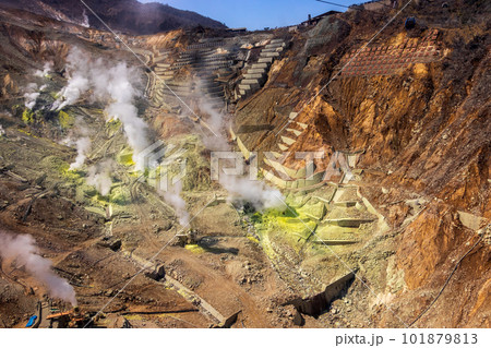 箱根・大涌谷の噴気 火山の山肌と立ちのぼる白煙