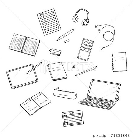 バッグの中身にまつわる手描きイラスト(モノクロ)