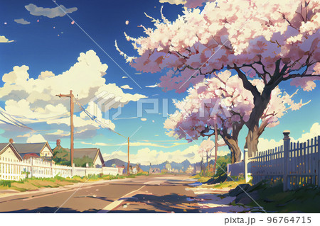 イメージ素材:アニメ風の桜の街並みの風景
