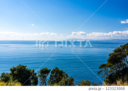 江の島南岸から江の島ブルーの海とその先水平線に浮かぶ伊豆半島を望む
