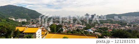 Panoramic view Kek Lok Si Temple Penang Malaysia. traditional Chinese architecture golden roofs pagoda lush greenery modern city skyline famous tourist attraction cultural heritage serene landscape
