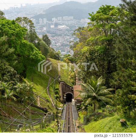Penang Hill funicular railway in Malaysia, moving down hillside, surrounded by dense tropical forest. Offers panoramic views of lush greenery and city skyline in distance. must-visit spot for tourists