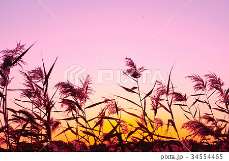 夕焼けと葦