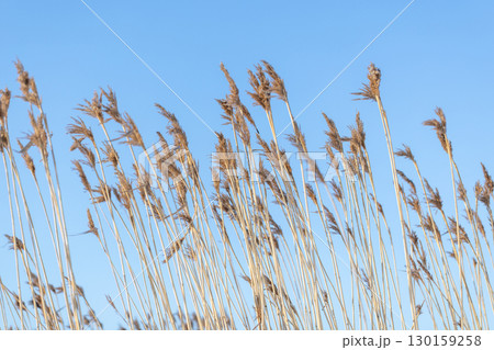 Thickets of dry reeds near the lake in spring or autumn.