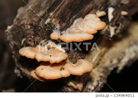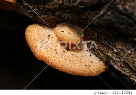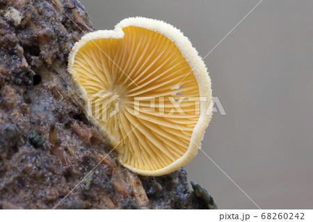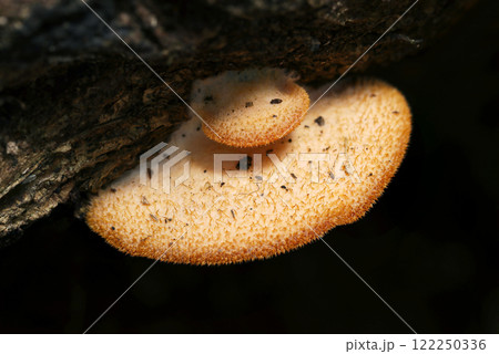 伐採貯木場の腐った丸太に毛が密生するベージュ色のキヒラタケ茸(マクロ撮影)